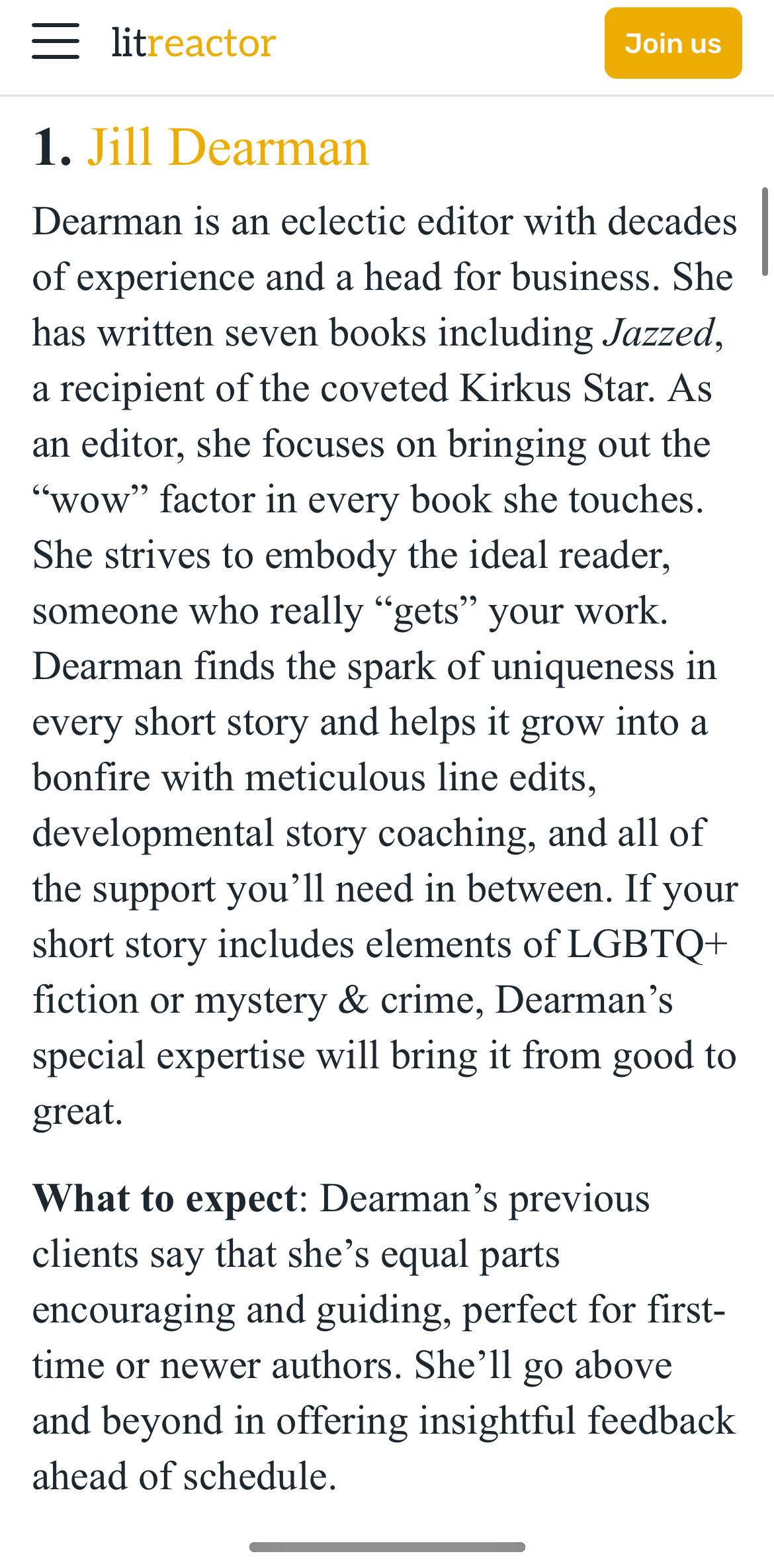 “Ace editor. Editorial rescue from a nurturing but whip-cracking, well-connected, celebrated author (Bang the Keys, Jazzed) who will help you unleash the true fabulosity in your projects and bring them to fruition in the real world before depression or drink destroy your nerve!”